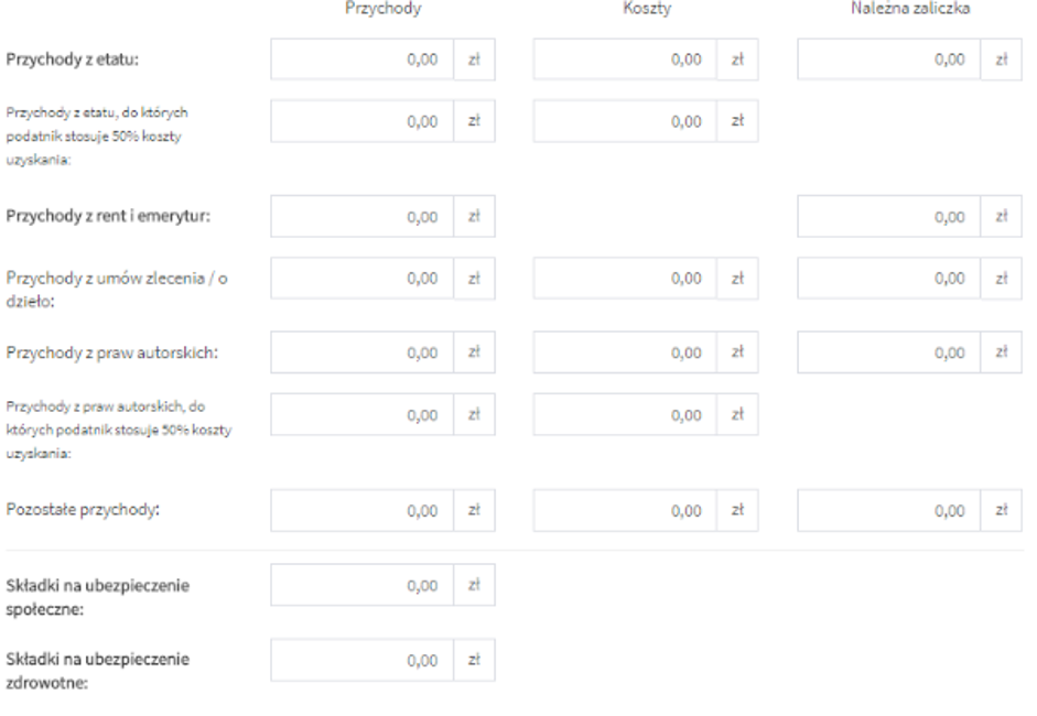 - Kolejnym krokiem jest wypełnienie pozycji, w których podatnik wpisuje wszystkie osiągnięte w poprzednim roku kalendarzowym przychody i koszty, określa ulgi, z których korzysta, a także uzupełnia wielkość składek.